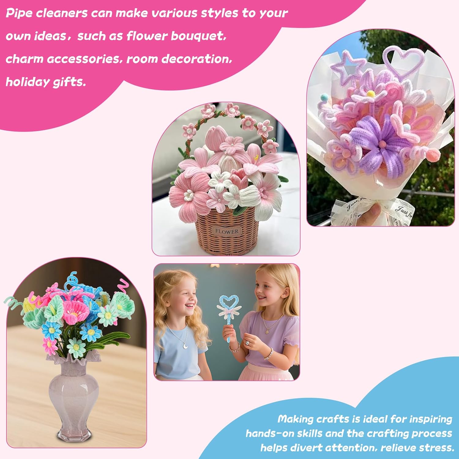 - 【Pipe Cleaners Craft Kit】Crafted with eco-friendly materials, these products are non-toxic,and without smell,they are easily bendable allowing you to twist and twine them into many shapes you fancy,you can handmade with Children,handmade gifts for friends,handmade bouquet in classroom.