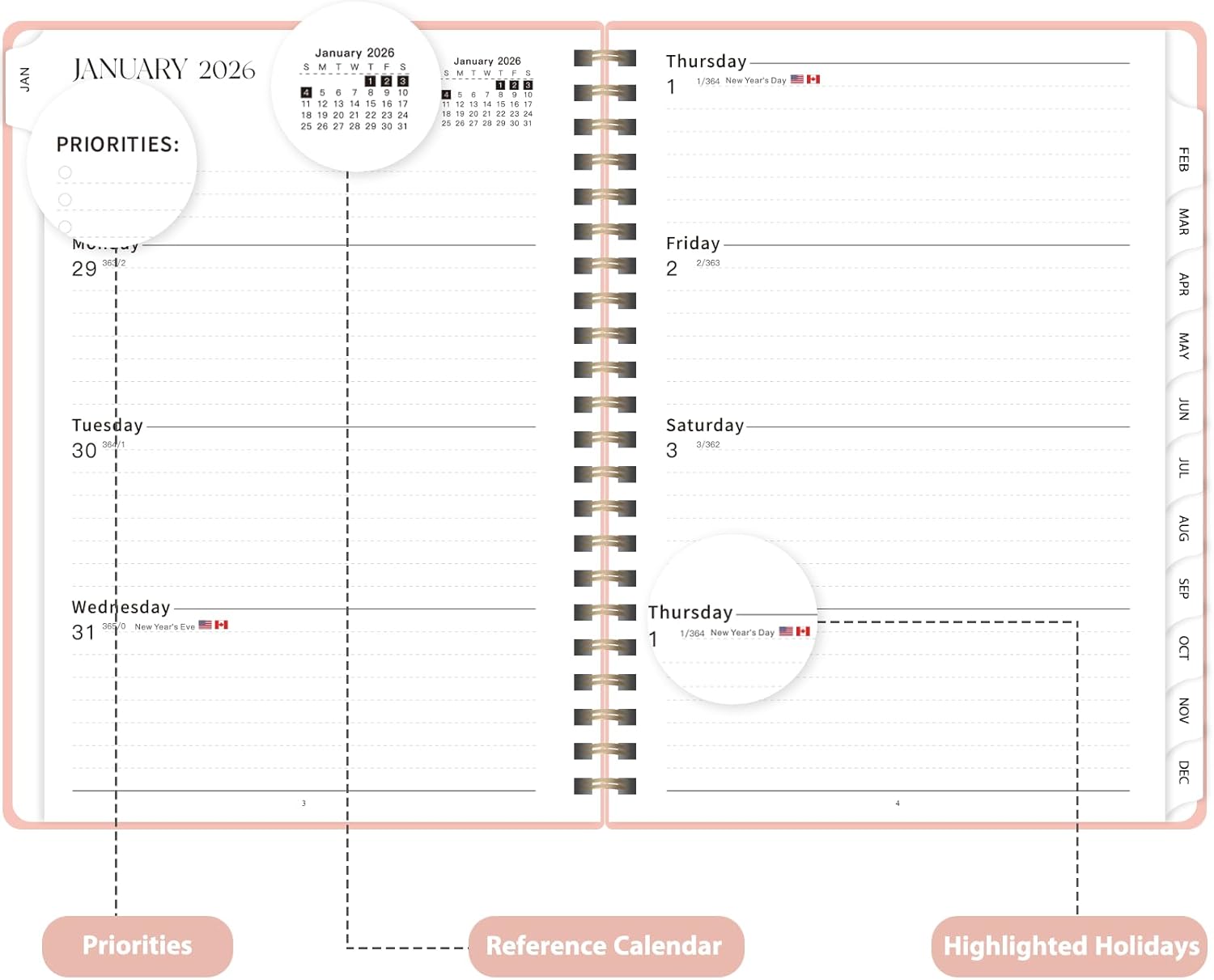 - [THOUGHTFUL DESIGN] – The agenda 2026 comes with an elastic band to keep it securely closed, monthly tabs for quick navigation, and a clear double-sided pocket for extra storage. Each monthly calendar page includes a motivational quote to inspire and keep you focused.