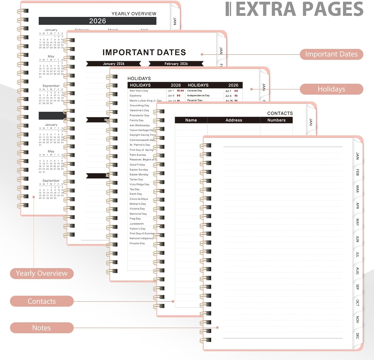 - [MONTHLY PLANNER] - With monthly calendar layouts, this 2026 calendar planner provides ample writing space, two-month reference calendars, contact page, important date page, and holiday list.