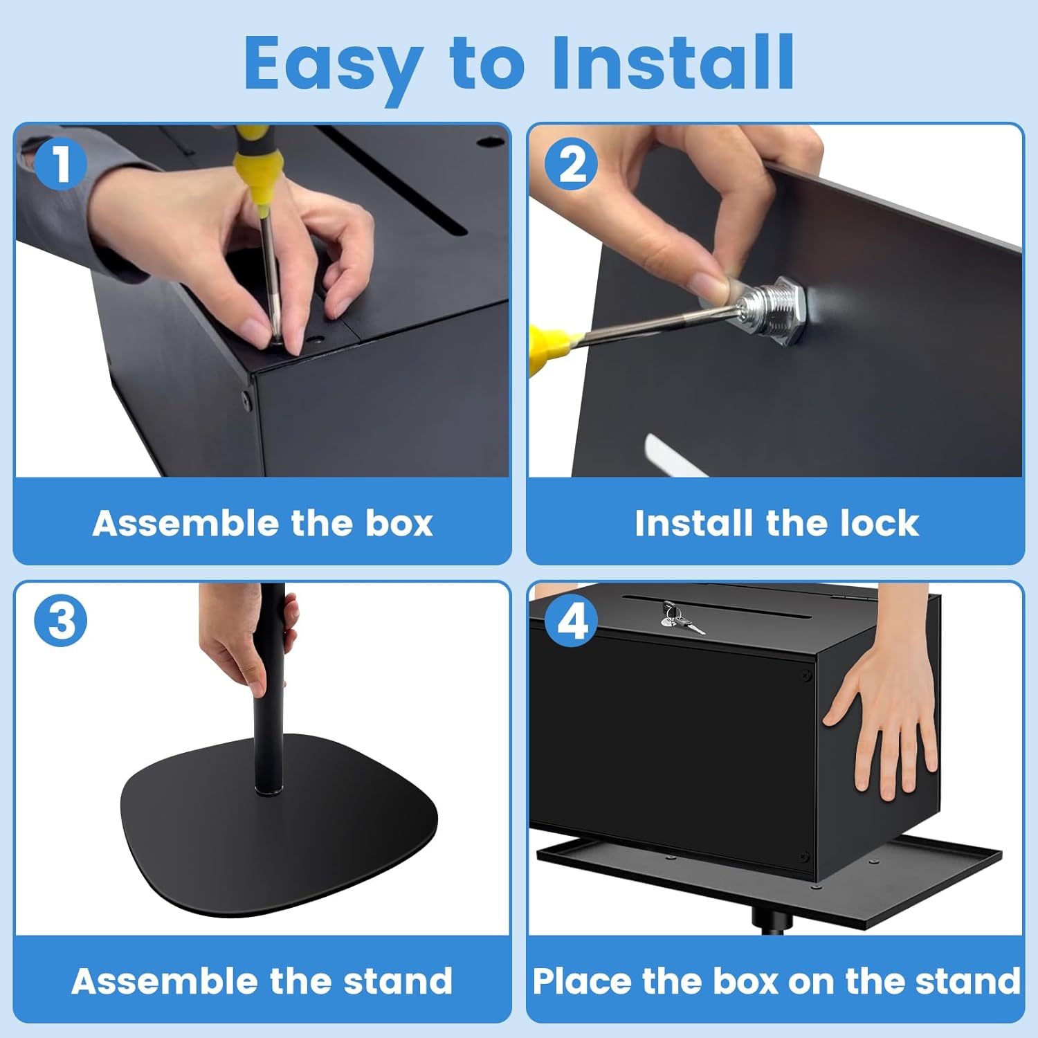 - Easy Assembly & Quick Setup: Assembly is required but straightforward. This metal suggestion box with stand comes with all necessary hardware and clear instructions for quick and easy setup. Note: The box may be heavy, when adjusting the stand height, please remove the box first.