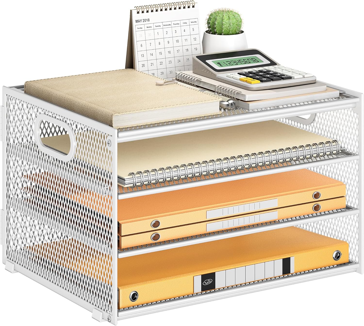 Subekyu Paper Letter Tray Organizer for Desk, White Metal Mesh Desk File Sorter Organizer with Handle and 2 Sliding Trays for Home Office School Supplies Organization