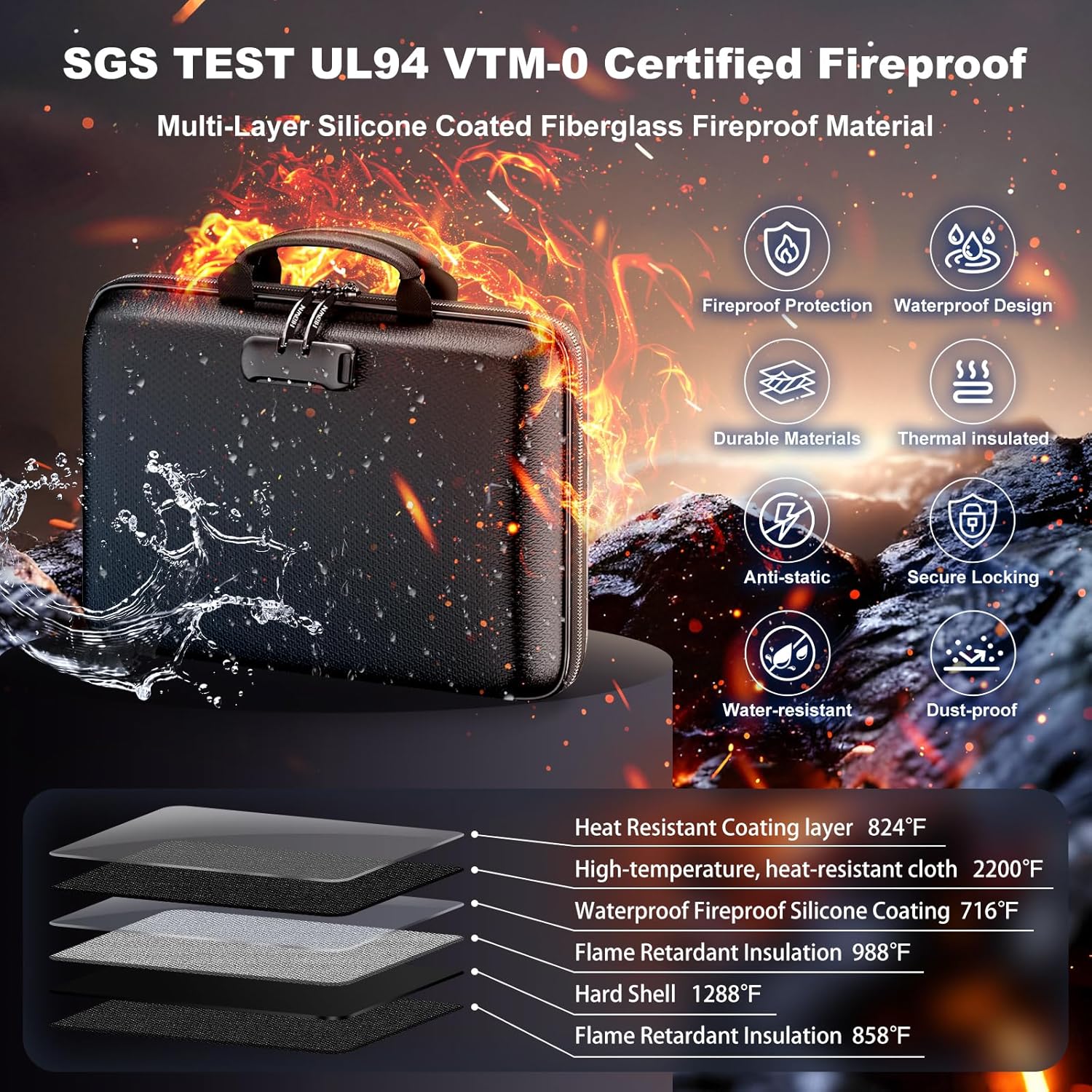 - UL-94 VTM-0 Certified Fireproof Box: HIBWN Fireproof document box is made of high quality flame retardant fiberglass, passed UL-94 VTM-0 professional fire resistance combustion test, with superb fire resistance. Surface used waterproof silicone coating, ensuring that your documents and valuables are protected in case of fire, flood or wet weather.