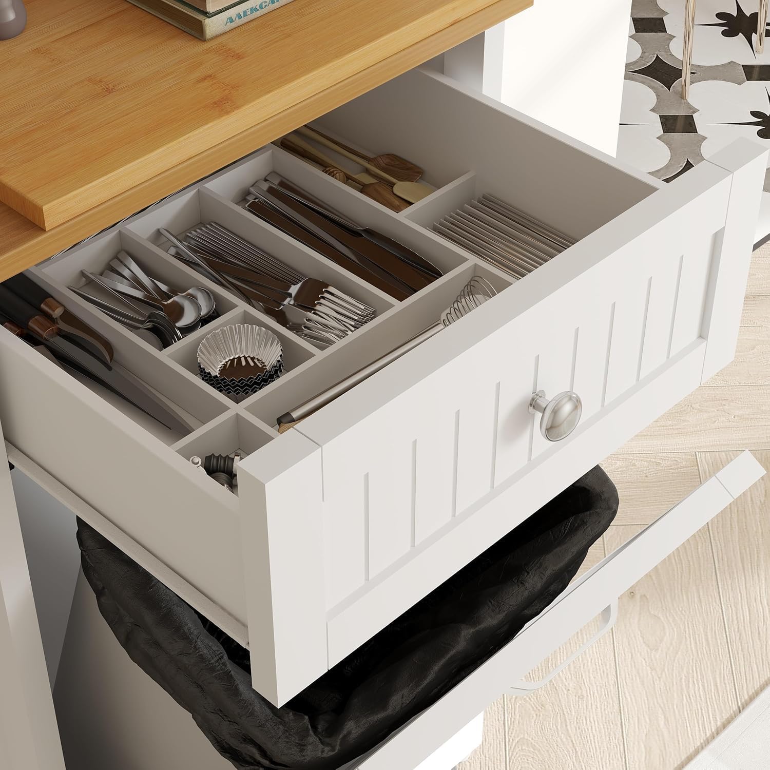 10 Gallon Tilt Out Trash Cabinet, Wooden Kitchen Trash Can Cabinet with Hideaway Drawer, Freestanding Laundry Hamper Garbage Recycling Cabinet on Wheels, Pet Proof, Single, White