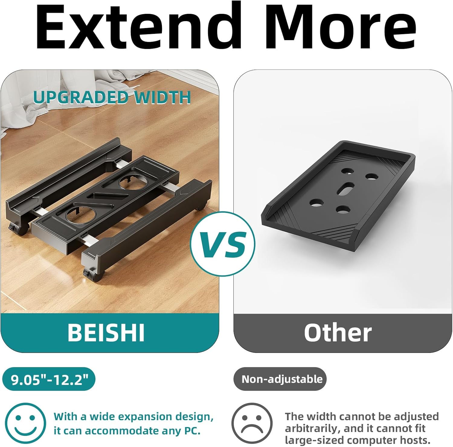 - WIDTH ADJUSTABLE: Our computer stand is width adjustable, width adjustable range is 9.05-12.2inches, length is 16.9 inches, it can support most computer towers on the market. If you are looking for a suitable stand for a variety of different sizes of computer hosts, this is a very good choice.