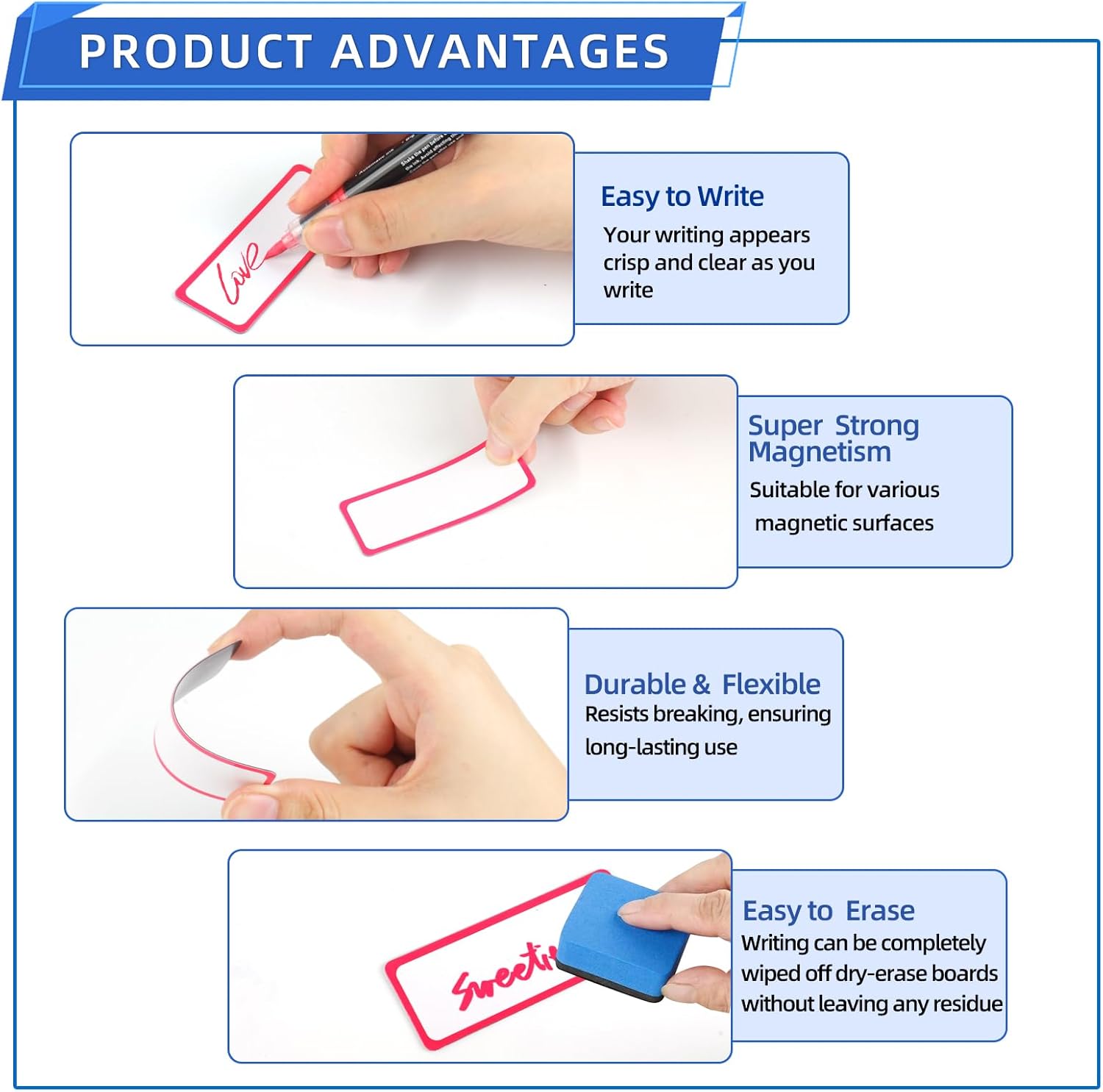 - Writable Label: These magnetic name tags for classroom are made of PET soft film and coated paper, with a smooth surface, smooth writing, and washable support. Therefore, you can rest assured to use an erasable pen to write on the nameplate without worrying about leaving any stains or marks