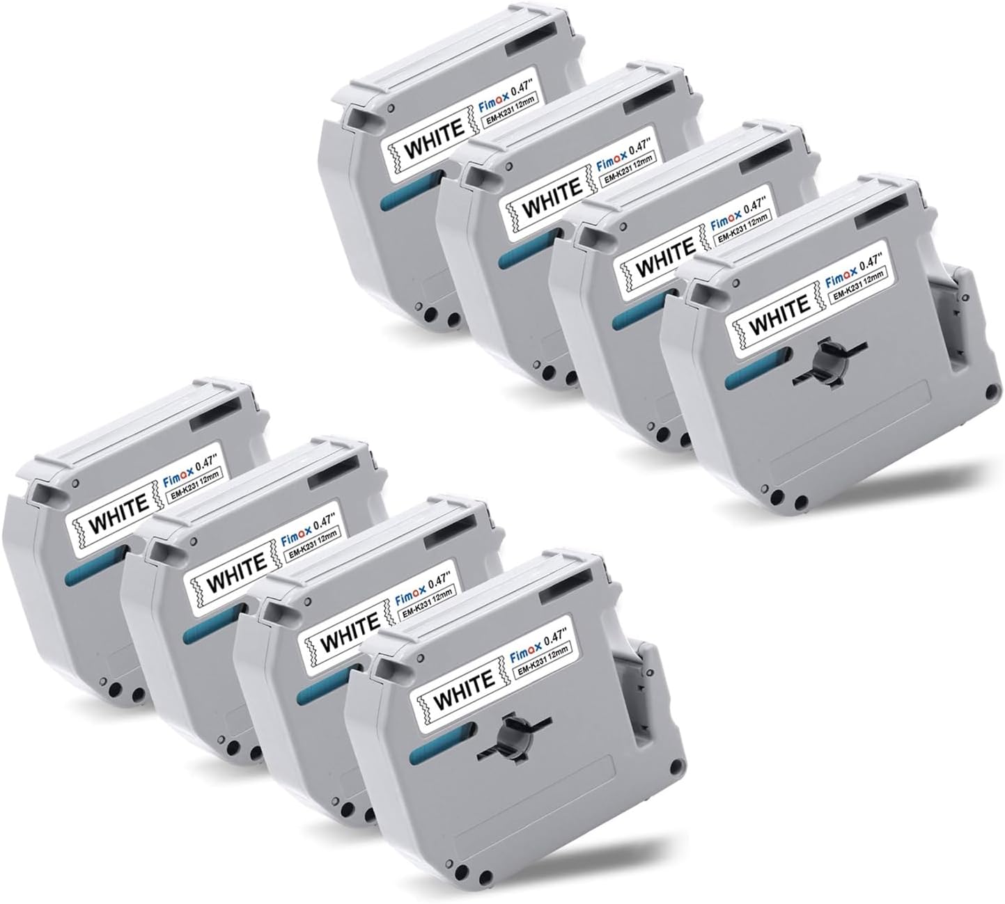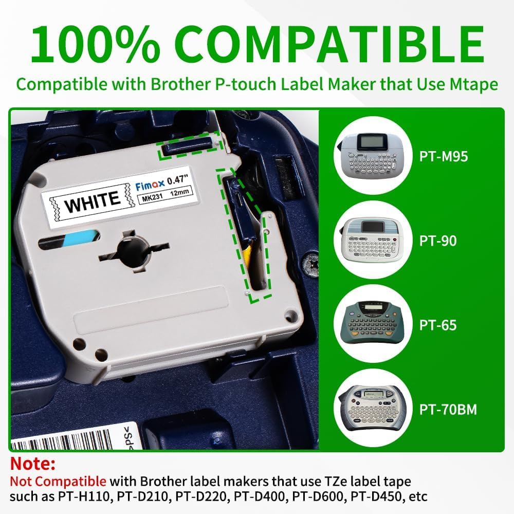 Fimax Replacement for Brother P Touch M Tape M231 MK231 MK-231 12mm 0.47 Inch to use with Brother PTouch PT-M95 PT-90 PT-70 PT-65 PT-85, Black on White, 26.2 Feet, 8-Pack