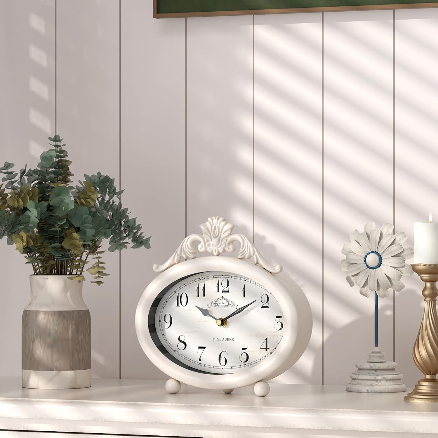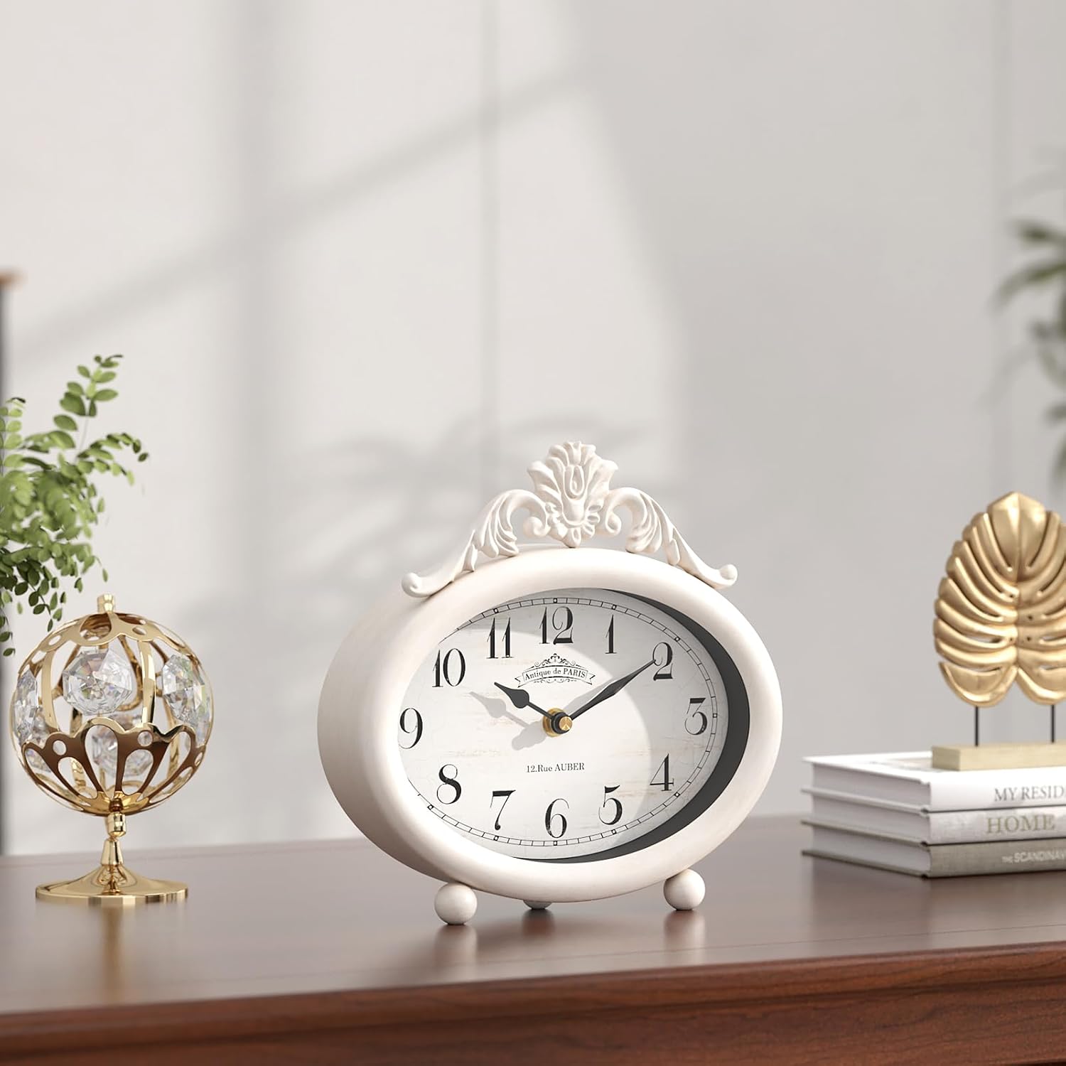 Vintage Table Clock, Desk and Shelf Decor Clock, French Rustic Antique Style White Mantel Clocks, for Farmhouse, Living Room, Bedroom, Bedside, Gift (7.87" H x 7.87" W)