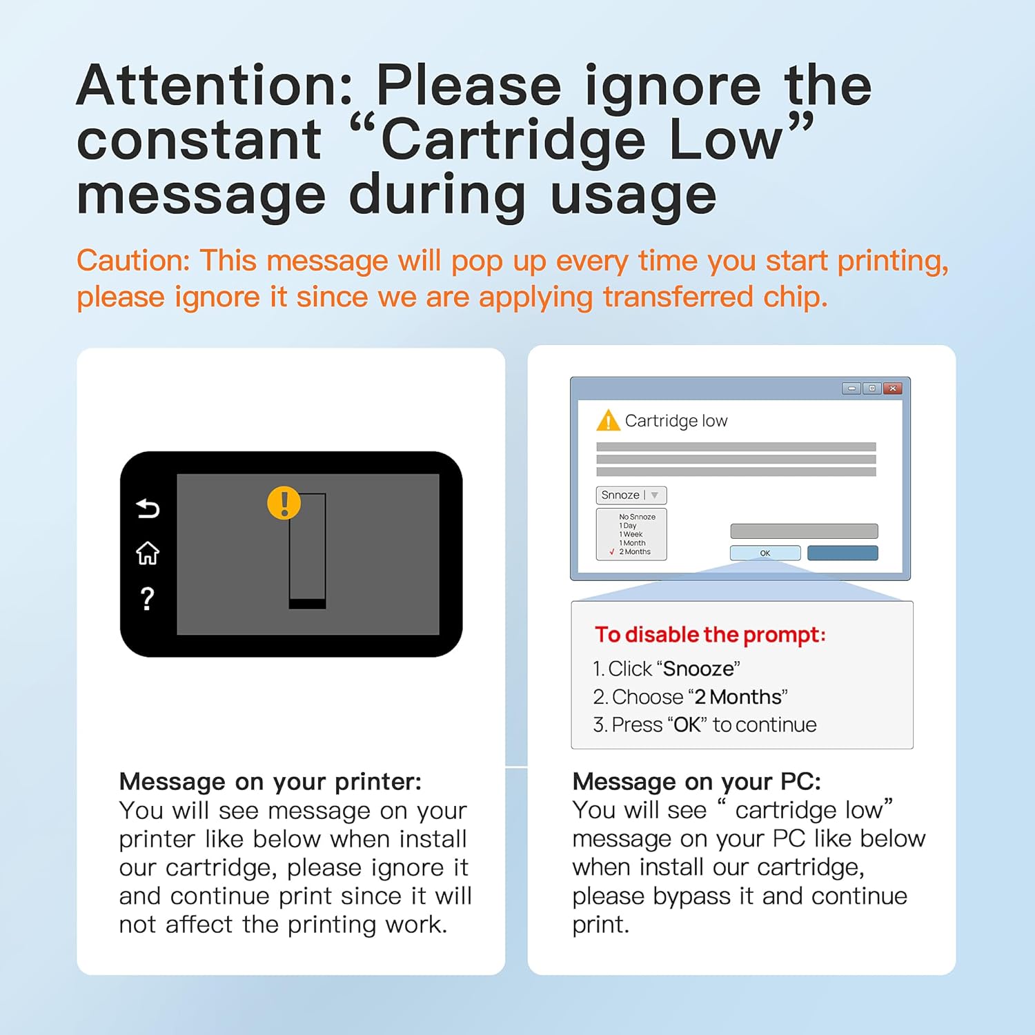 - Low Ink Tips: The printer working with our toner could not show the remaining toner level ,but which would not affect the printing and page yield.