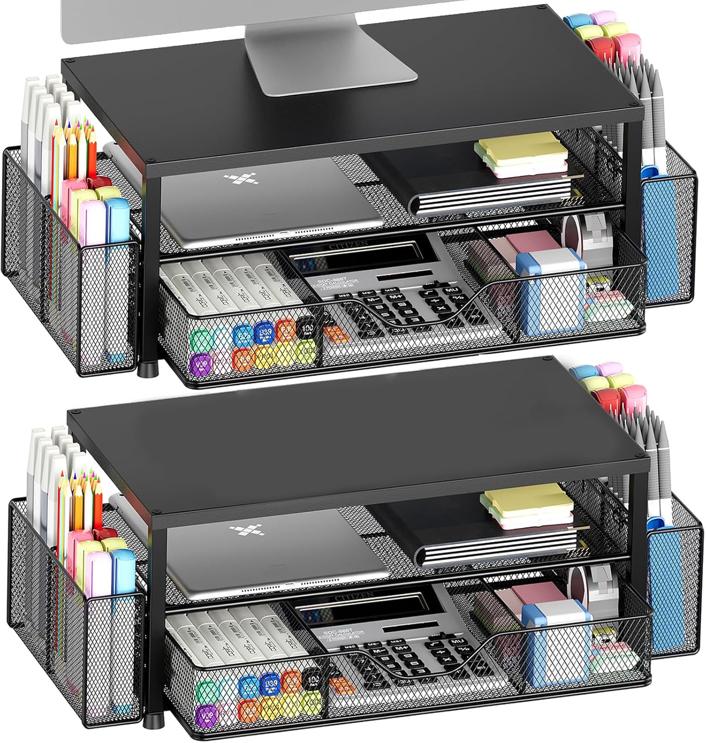 Desk Organizer and Accessories, 2-Tier Computer Monitor Stand Riser with Drawer and 2 Pen Holders, Laptop Stand, Office Desk Accessories for Office Supplies, Black 2-Pack