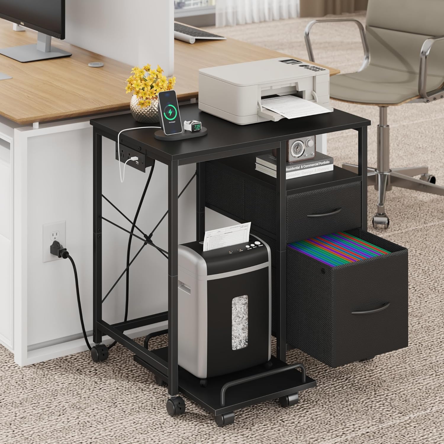 Printer Stand with Power Outlet/Fabric Drawers, Printer Cabinet with Storage Shelf and Rolling Shredder Stand, Printer Table for Home Office, 25.6"×17.7" Black