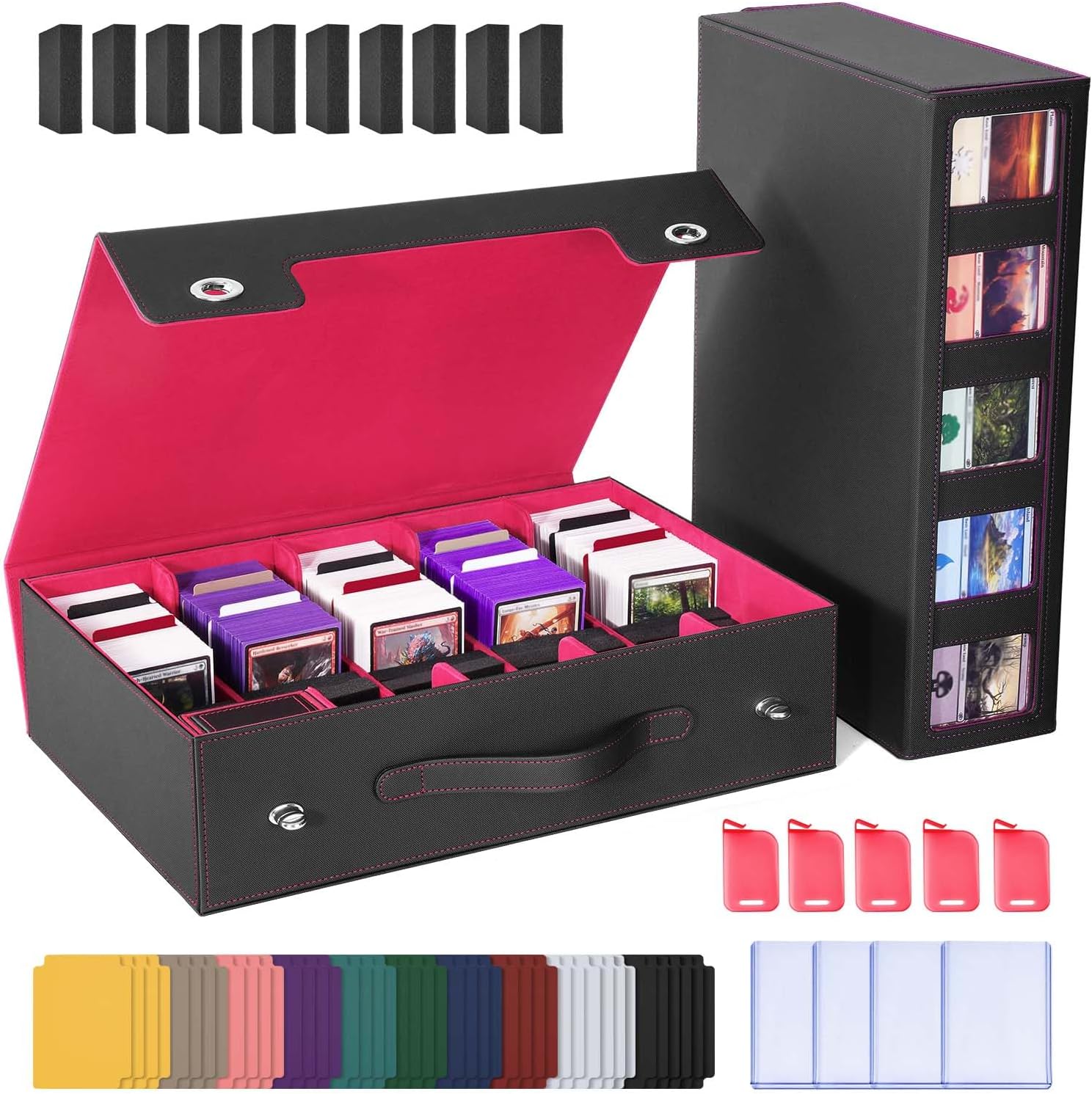 - 【Accessories】 5 top loaders, 48 removable colored dividers (for sorting and labeling different game cards), 10 foam blocks (for securing and organizing partially filled card sets), 5 stoppers (to prevent cards from moving when the box is not completely filled), and 1 dice tray (for storing dice, tokens, and counters).