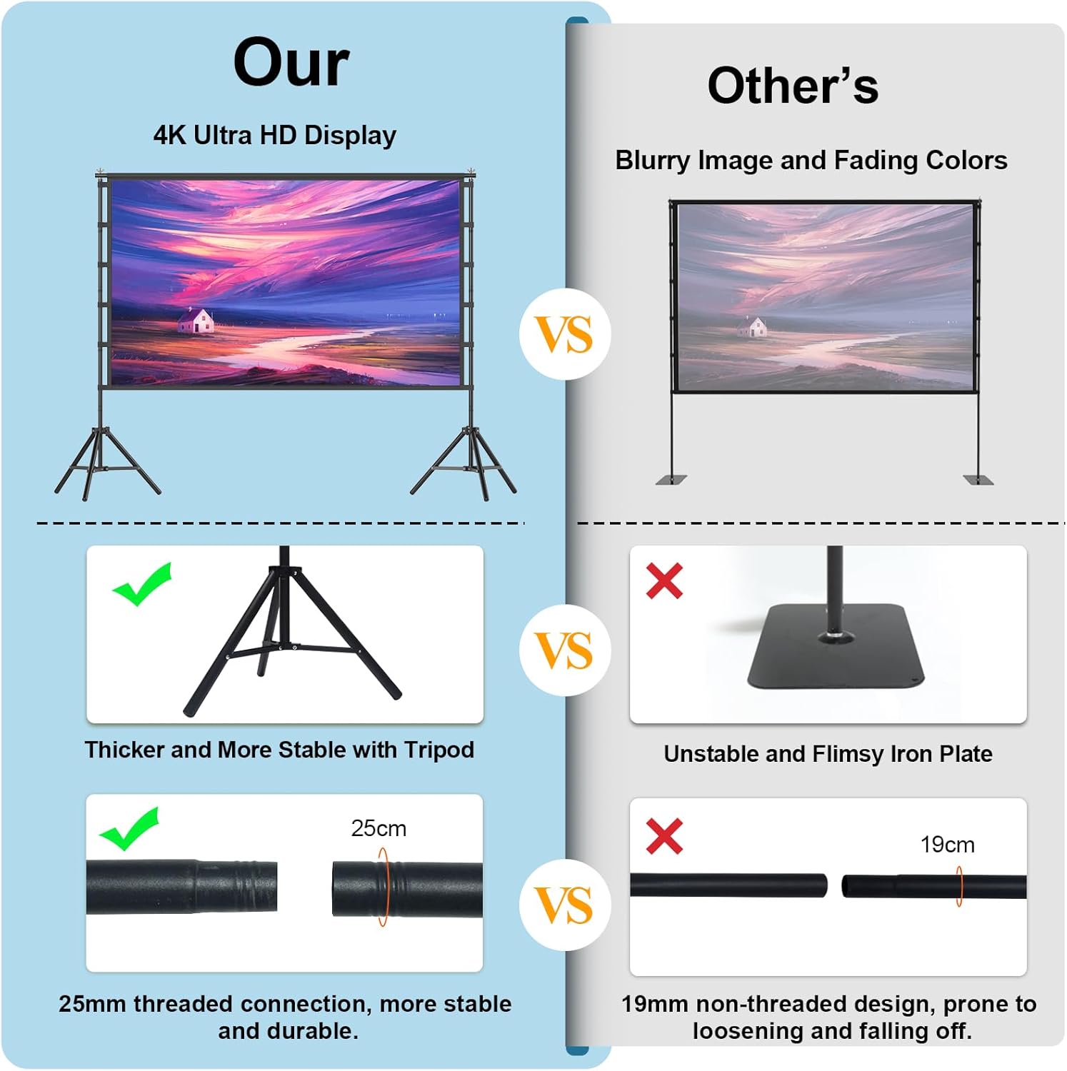 - Quick Setup: The outdoor movie screen includes a user-friendly installation instruction and a setup video, allowing you to set up effortlessly within minutes without any tools. The foldable projector screen stand design also makes disassembly a breeze. We recommend two people to collaborate for quicker setup, ensuring a hassle-free viewing experience from the outset.