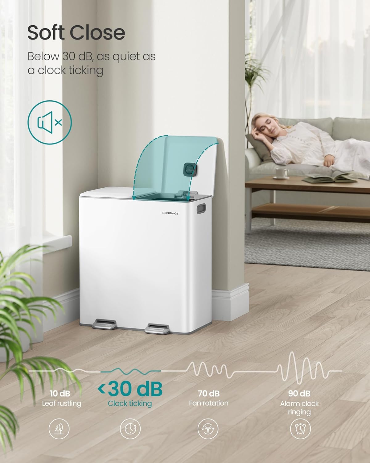 SONGMICS Trash Can, 2 x 8 Gallon (2 x 30 L) Double Garbage Can with Soft-Close Lids, Removable Inner Buckets, Pedals, Stainless Steel, for Waste and Recycling, Cloud White ULTB743W01