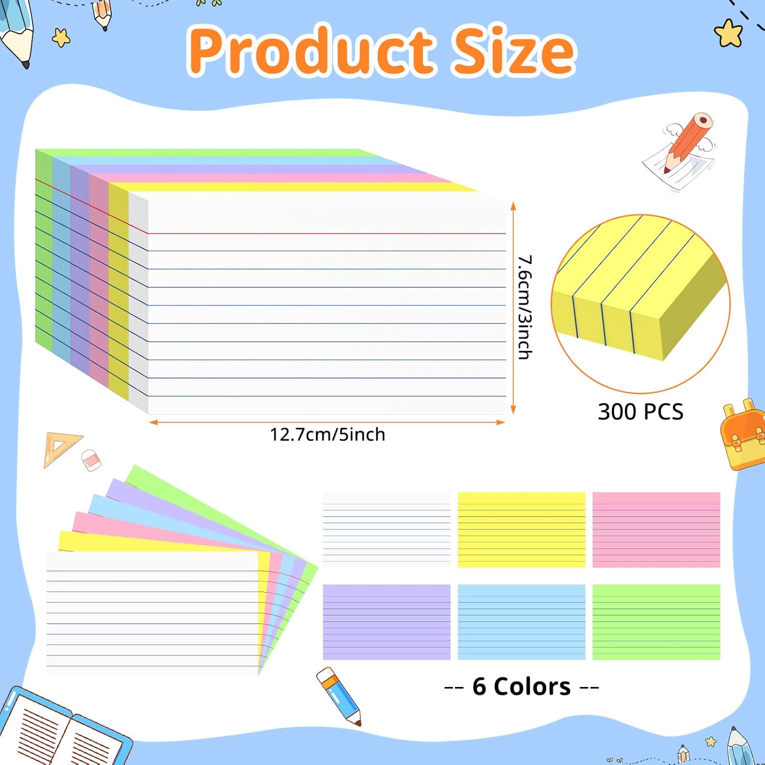 Index Cards 3 X 5, 300 Count, Colored Flash Cards For Studying, Lined Flashcards Notecards, Study Card, Ruled Front And Blank Back, Heavy Note Cards For Office, Home And School