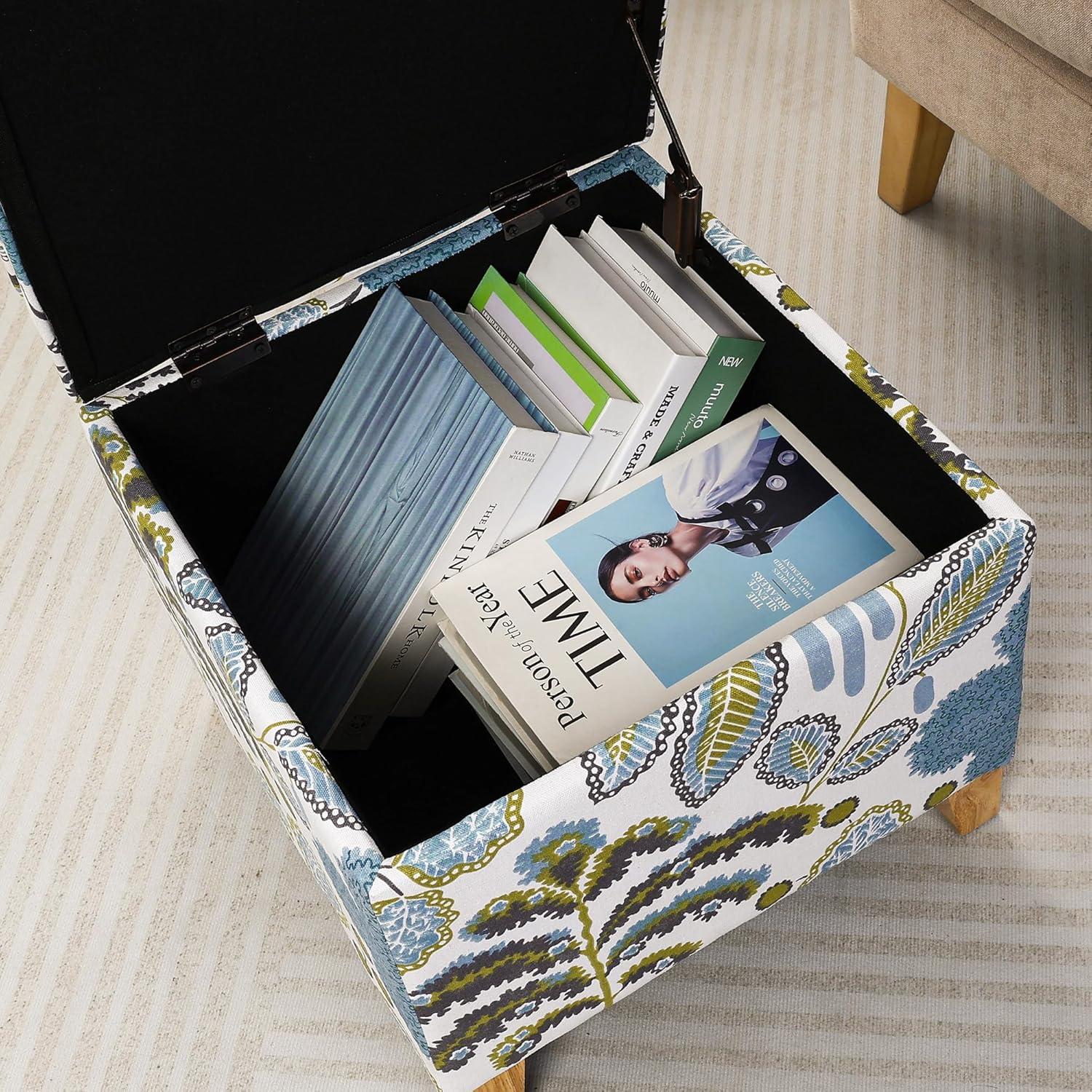 Adeco 18 Inch High Cube Ottoman Storage, Linen Chair Foot Stools, Upholstered Vanity Stool with Hinged Lid, Solid Wood Legs (Blue Leaves)