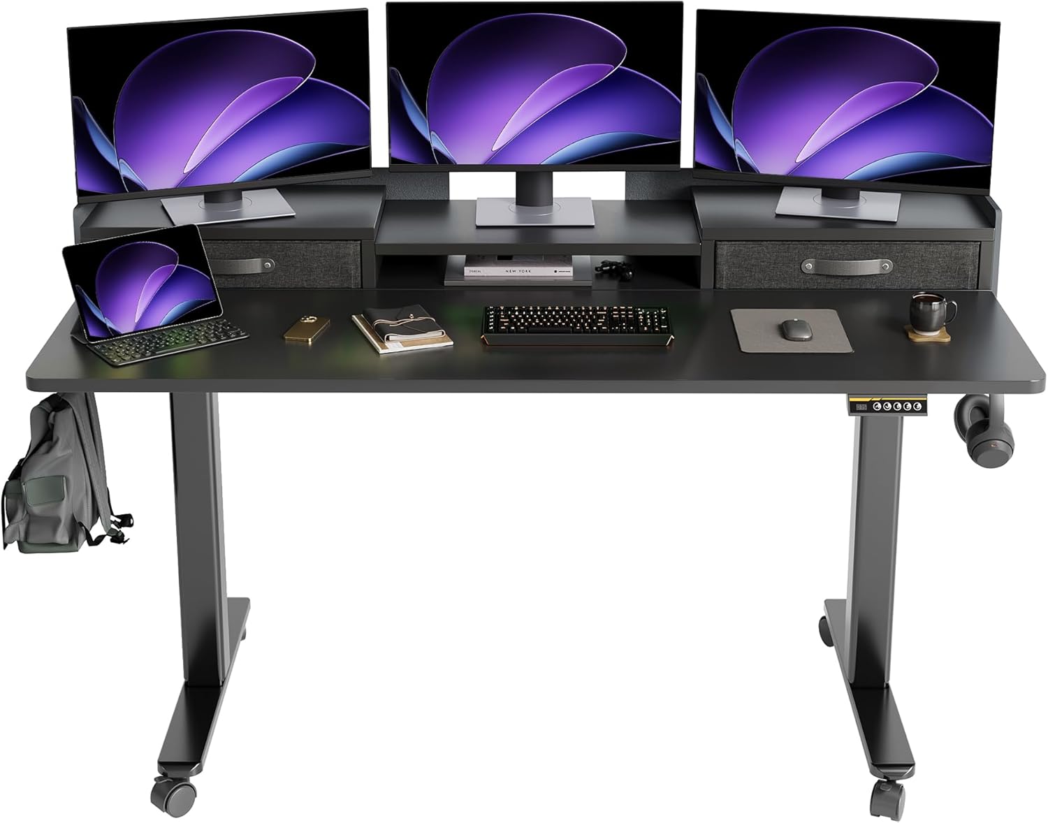 YDN Standing Desk with Drawers, 59 Inch Standing Desk Adjustable Height, Adjustable Electric Stand Up Sit Stand Small with Storage and Shelf, Black